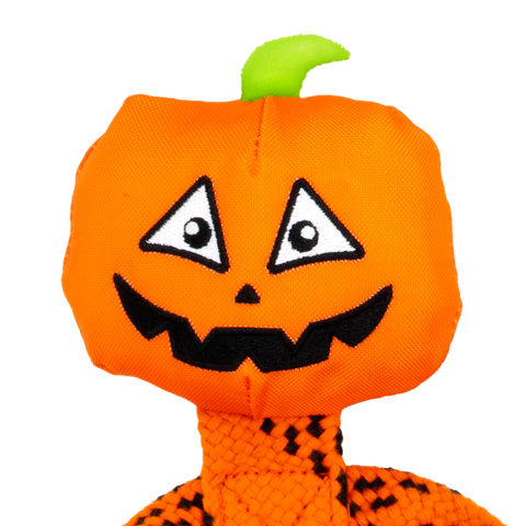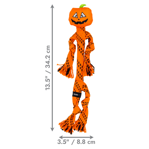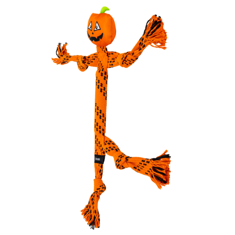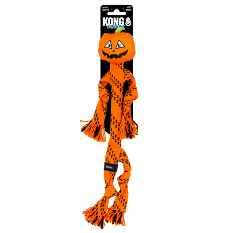 KONG Halloween Scrubz Jack-o-Lantern brings a frightening amount of fun to playtime, providing endless excitement for trick-or-treating pups! This floppy orange Halloween character is made with woven rope, which helps support doggie dental health by cleaning their teeth and gums as they play.