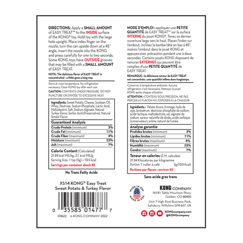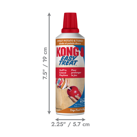 KONG Easy Treat Holiday Feast brings the heartwarming flavors of the holidays to your dog's favorite KONG toys with just a squeeze. The convenient nozzle makes it simple to fill any rubber KONG, Spinz, or Licks toy with wholesome holiday comfort food. Dogs love the irresistible blend of turkey and sweet potatoes, and you'll love convenience of the mess-free nozzle. Also perfect for treating during walks or training sessions with a squeeze of the nozzle. KONG Easy Treat will keep your furry family member happily occupied with their KONG, leaving them begging for more treats from their toy, not from the table this holiday season.