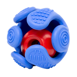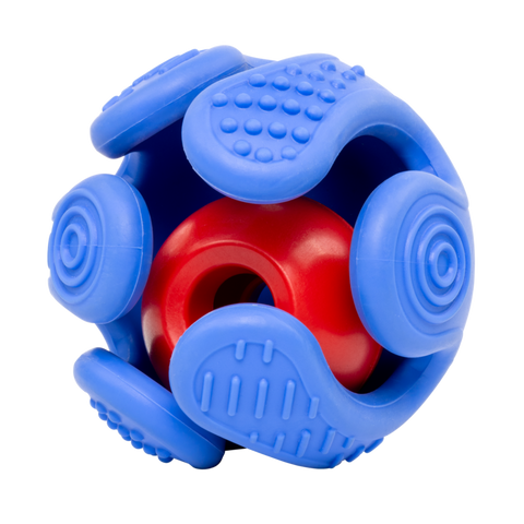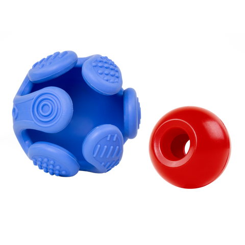 KONG Rewards Wrapz is an action-packed, nested treat dispenser that rolls unpredictably, dispensing treats as dogs nudge and prod with their noses and paws. This ball is ideal for daily enrichment, keeping dogs busy and engaged. Treats are held in a hard inner ball, wrapped in a durable, textured bumper ball on the outside, creating a rattling, thumping sound that excites dogs and sparks foraging instincts.