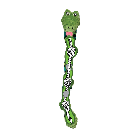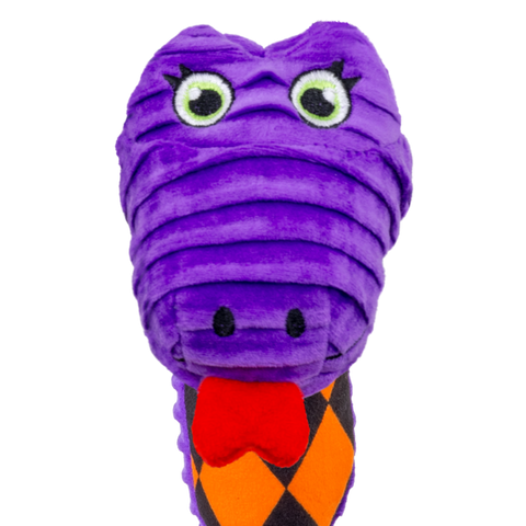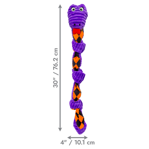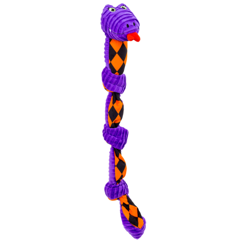 KONG Halloween Knots Snake has its knots all tied up and is ready to play all night long! This low-stuff plush snake is built to endure pulling and light chewing. It features an internal knotted rope that caters to dogs' playful instincts to thrash, tug, and wrestle. Varied textures and squeakers keep play sessions going, but this floppy friend is the perfect snuggle buddy when naptime comes. Our adorable snake makes a fantastically floppy trick-or-treating companion, allowing your dog to join in on the spooky fun.