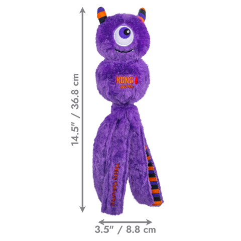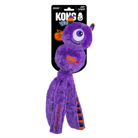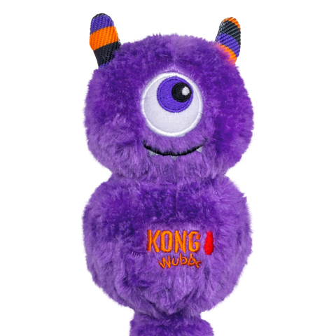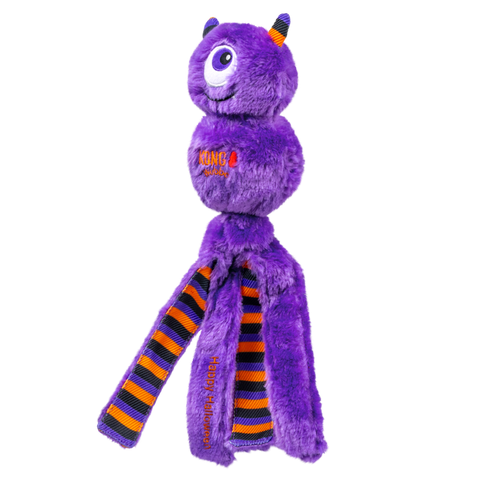 This monster prefers snuggling in bed to lurking underneath it. KONG Halloween Wubba Monster features a long, floppy tail to ignite dogs' shaking instincts, adding fun and excitement to tugging sessions! This purple monster is covered with soft, plush material, making it gentle on dogs' teeth. Plus, its long tails make it easy to pick up, throw, and fetch. Our Halloween Wubba is perfect for both interactive and independent playÑcomplete with a squeaker that emits a mighty roar to signify it's time to mash some monsters! Its soft fur makes this Wubba not only a perfect cuddle buddy for nap time, but also a comforting toy that your dog can carry around the house and show off to friends.