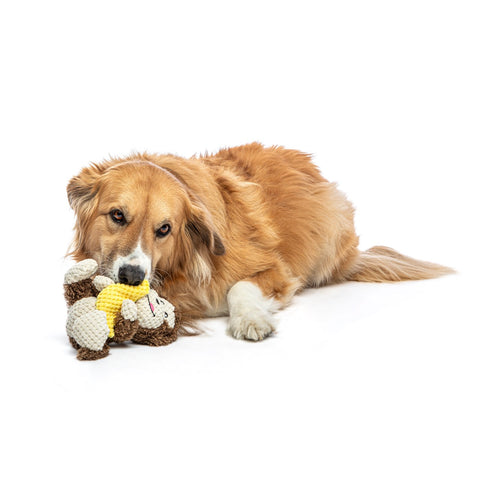 Made tough for long play sessions, they squeak and crinkle for added intrigue to keep a dog’s attention and engage instincts. These bright, chewable pals are available in a variety of animals including a monkey, bunny, frog, bear, and pig.